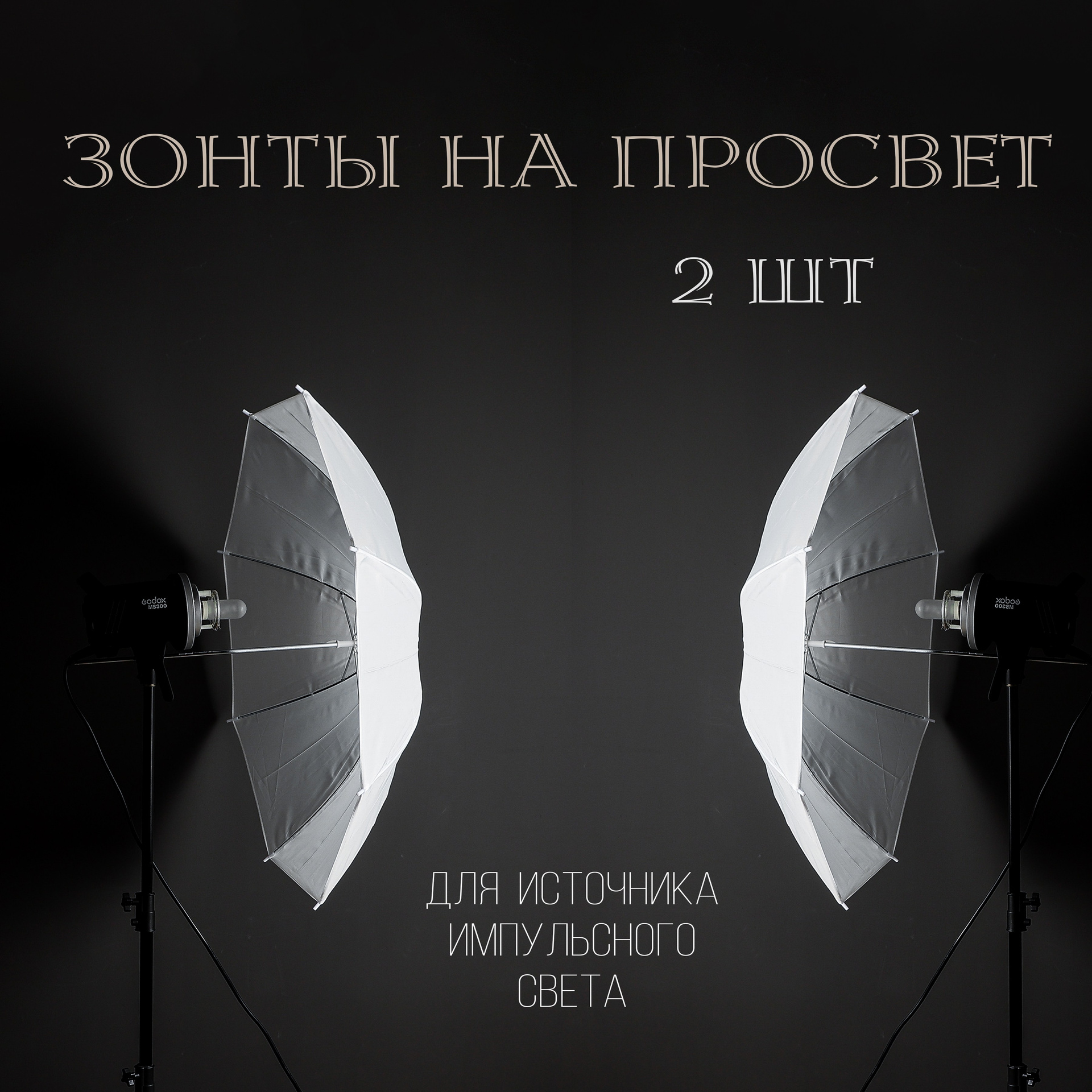 Godox 300 дж, 2 головы. Импульсный свет. Светомоделирующие насадки: 2 зонта на просвет, 2 софта 40/60, стрип 30/120 с сотами, октобокс 95 с сотами, тубус с фильтрами, рефлектор с решеткой